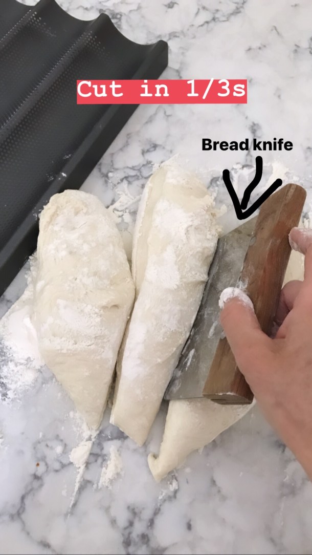 9. Shape into 3 baguettes using hands and the side of bread knife.