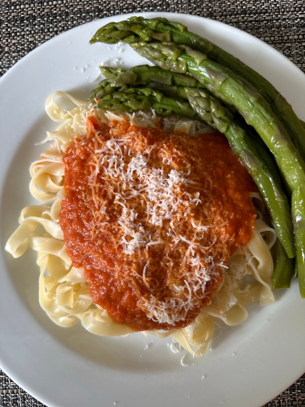 Roasted Red Pepper Sauce is a very forgiving thing to make. If you want a stronger pepper flavor then add less tomatoes. The proportions do not have to be exact. I like a lot of onion and garlic. The tomatoes can be a sauce or crushed or whole. If you have a favorite variety of tomatoes use those.