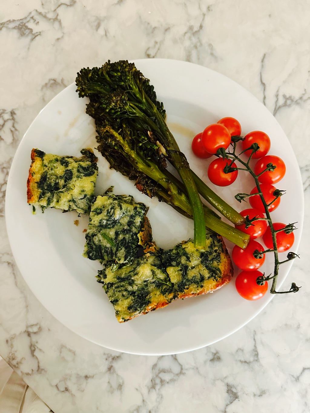 Spinach Cheese Squares served with broccolini and cherry tomatoes