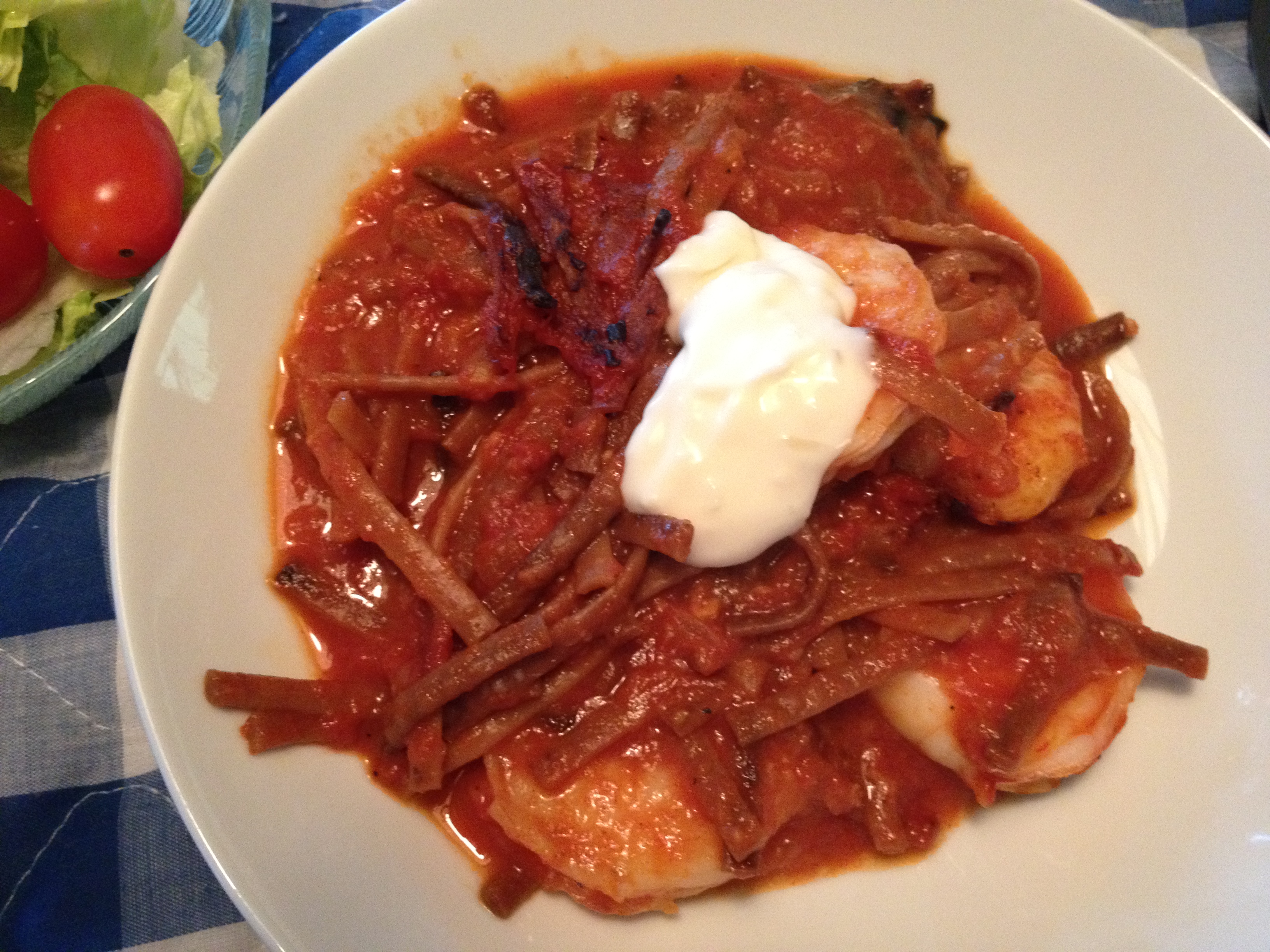 This recipe has more sauce than the authentic version. I was cooking this for my mom who prefers more sauce. Look for my other Fideua recipe for the more authentic version. As you can see from this photo, I used a thicker fettuchini pasta which is not authentic.