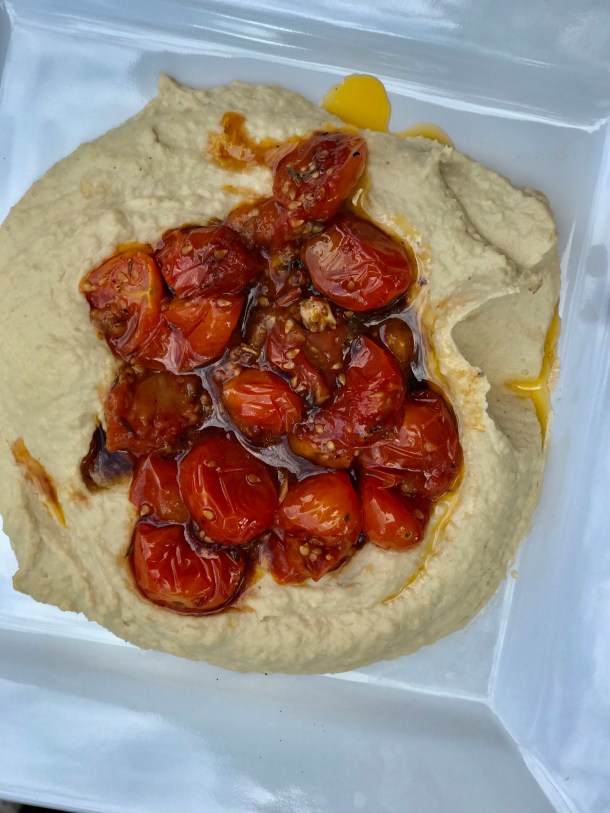 Another addition is roasted red cherry or grape tomatoes. Toss them on a sheet pan with olive oil, salt, fresh thyme and oregano. Bake at 375 for 20 minutes or until blistered and beginning to brown. Drizzle with an aged balsamic and pour over a nest of hummus