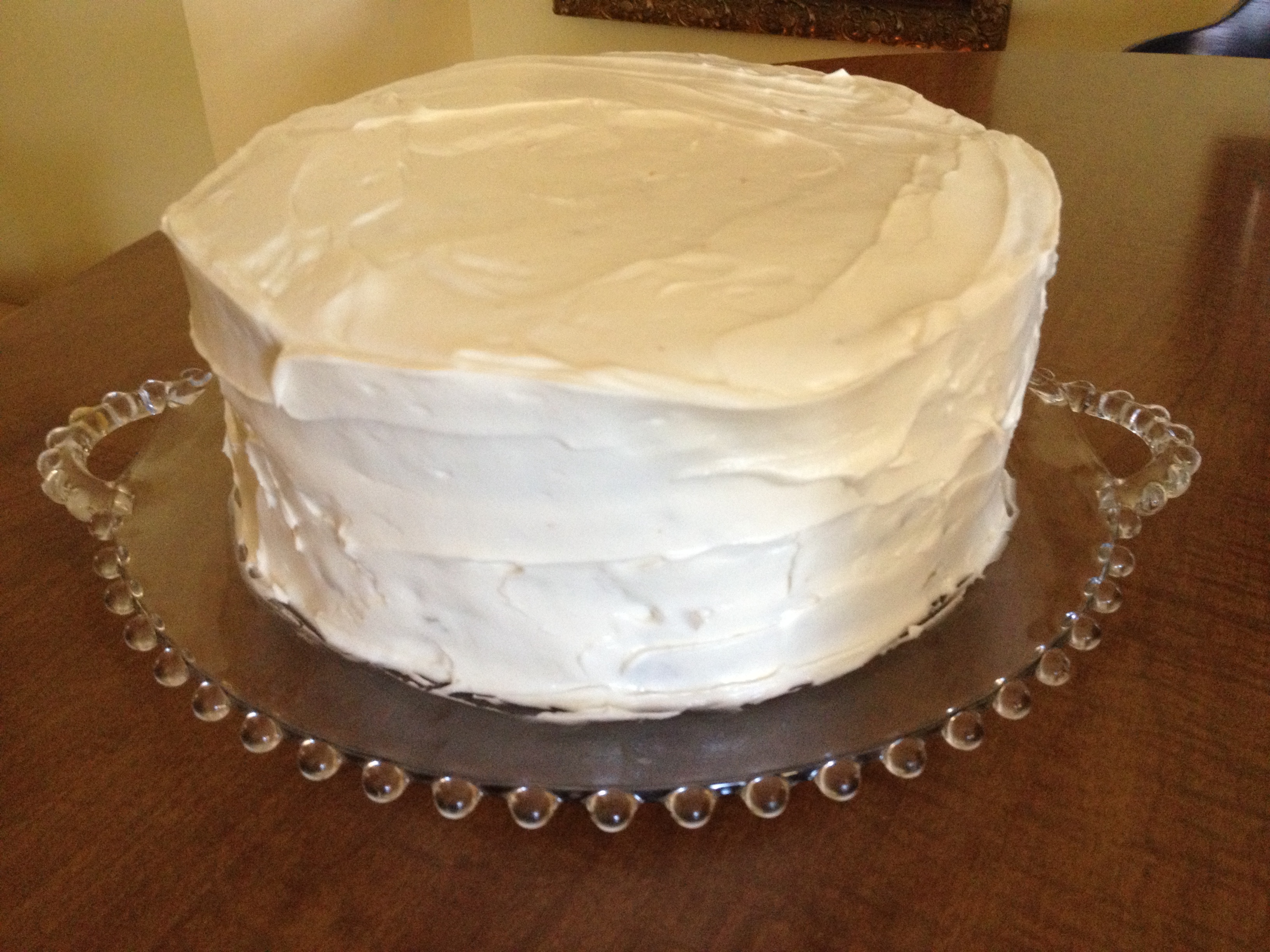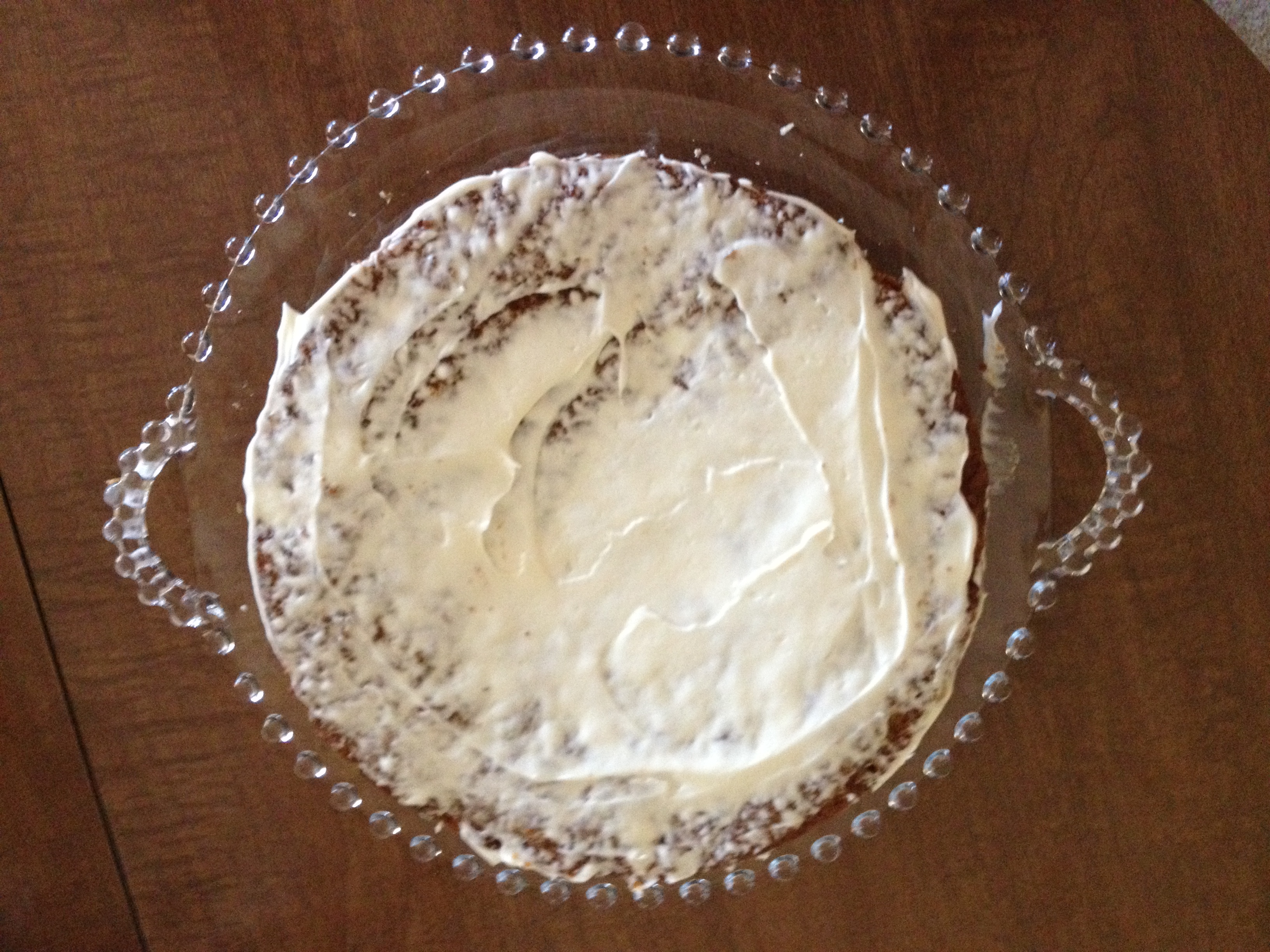 The first layer thinly spread with Cream Cheese FrostingAunt Lois Sanders Zuro shared this recipe in 1970. It’s been a family favorite ever since!