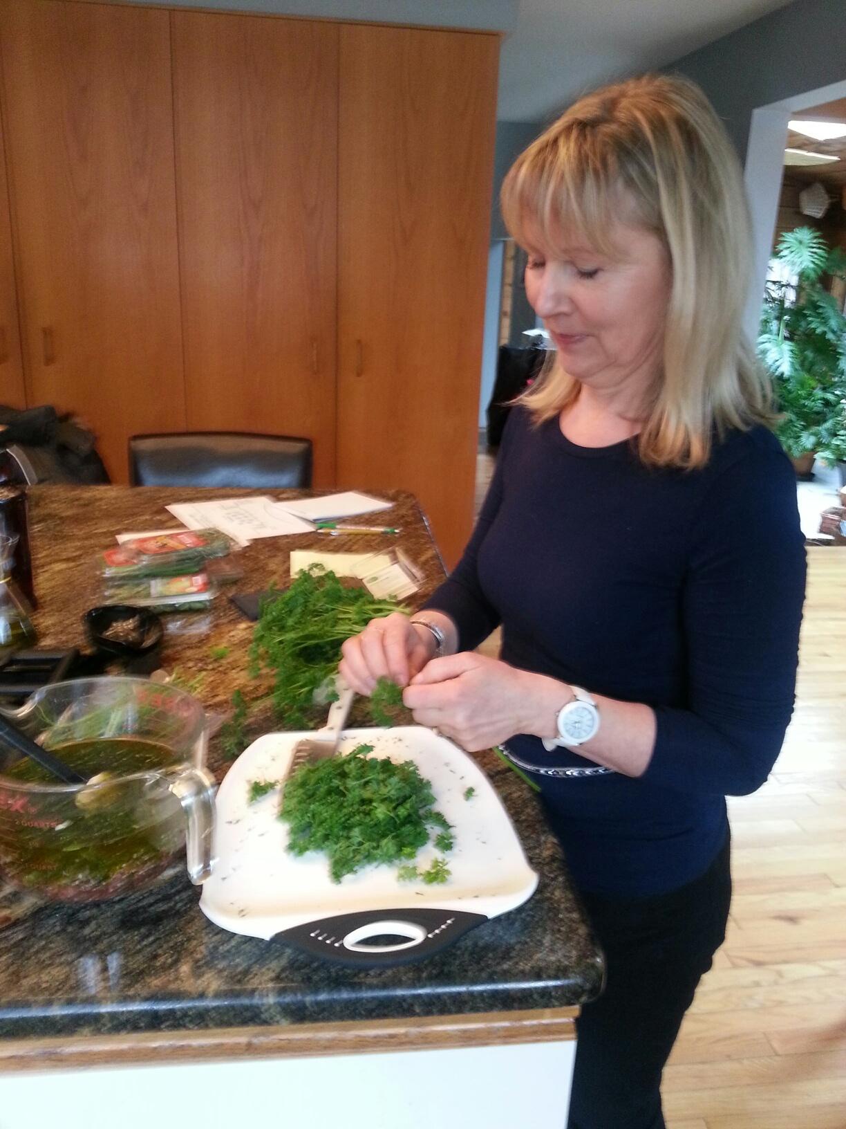 - In a medium glass or ceramic bowl combine vinegar, oil, garlic, herbs, salt and pepper.