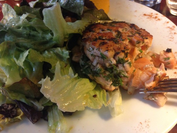 This a new way to eat salmon for me! Diced and tossed with olive oil, lots of coarsely chopped fennel fronds, shallots and then formed into a mold. Mine was quickly seared on each side and raw in the middle. Most Parisians eat it raw or tartare. We ate this in the St Germaine quarter near our apartment at Cafe de l’ Empire.