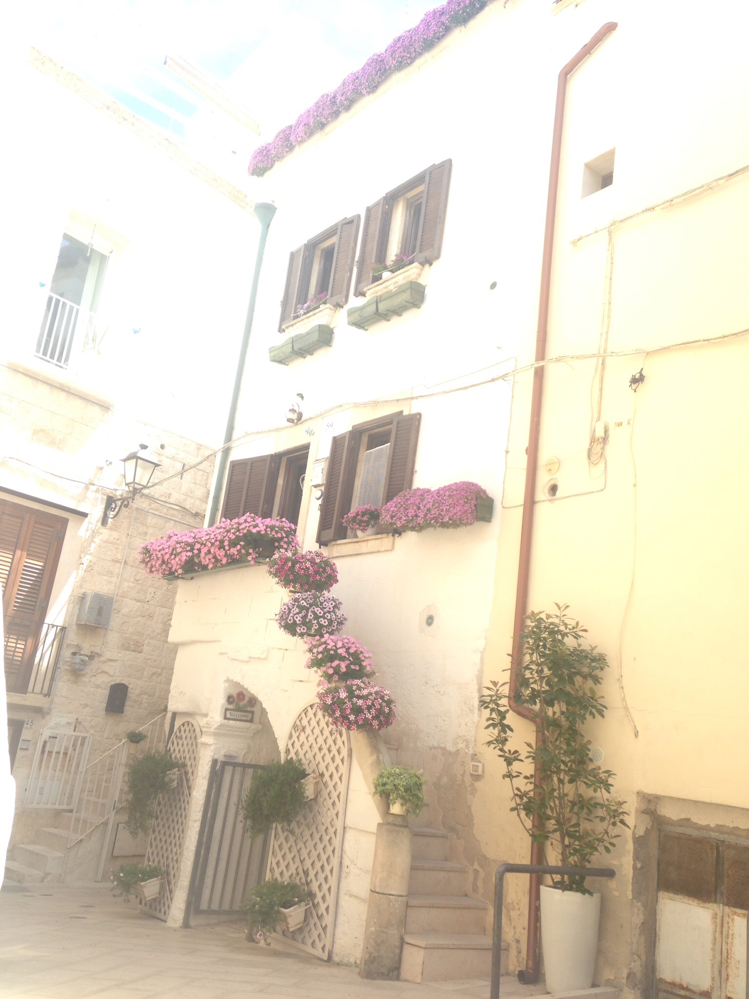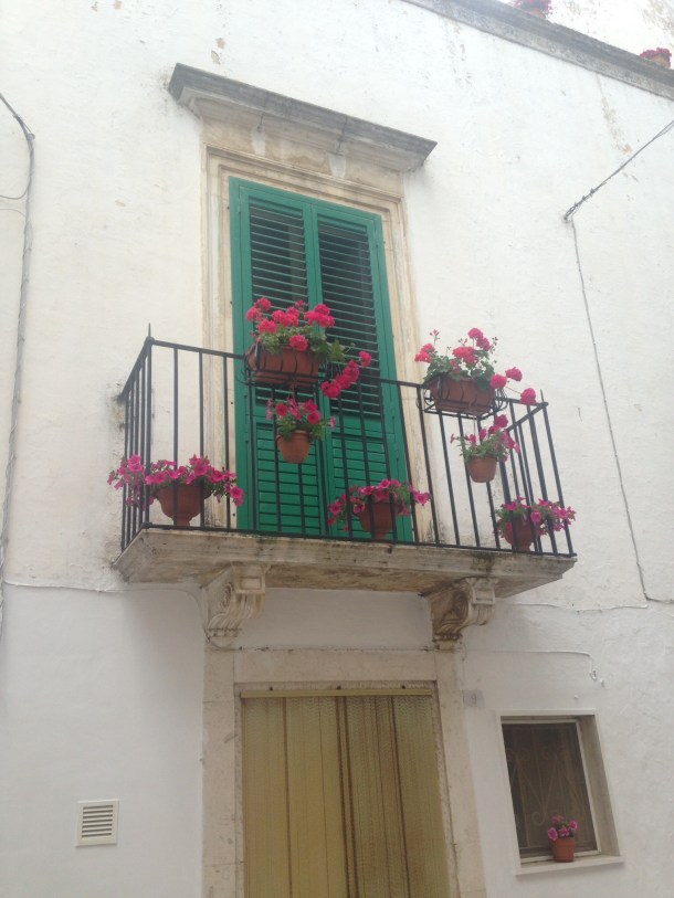 Locorotondo is a quiet peaceful place painted white and filled with colorful flower pots.
