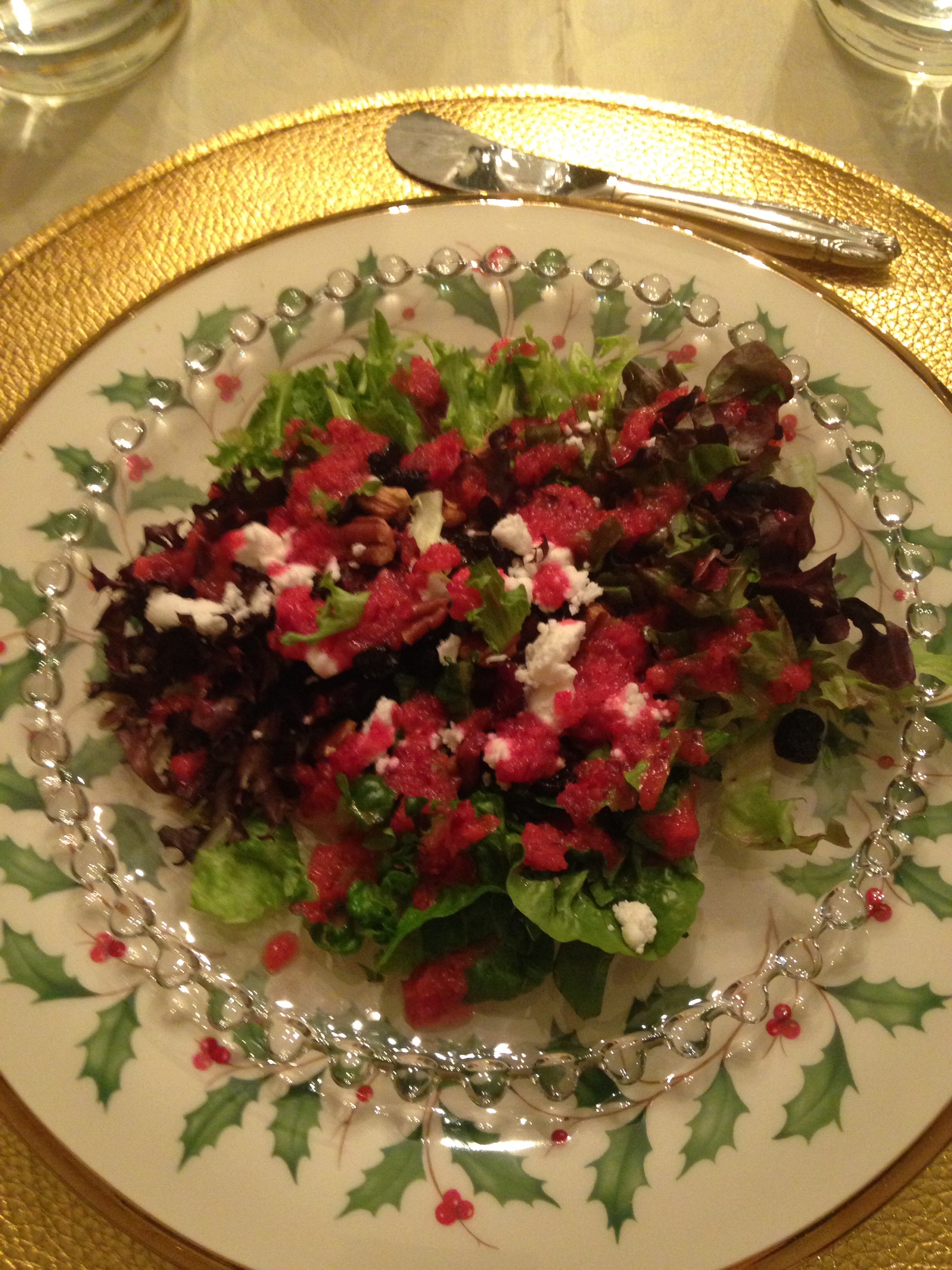 Jan Doty shared this colorful salad at a dinner party and I’ve made it three times this month! It’s a tart dressing added to lettuce, toasted nuts, sweet dried fruits and creamy goat cheese crumbles. Love it!