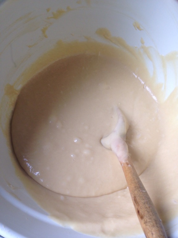 - Add egg mix to flour and beat with the back of a wooden spoon against the front side of the bowl. Turn the bowl 180 degrees frequently.Or beat with the paddle of a mixer.