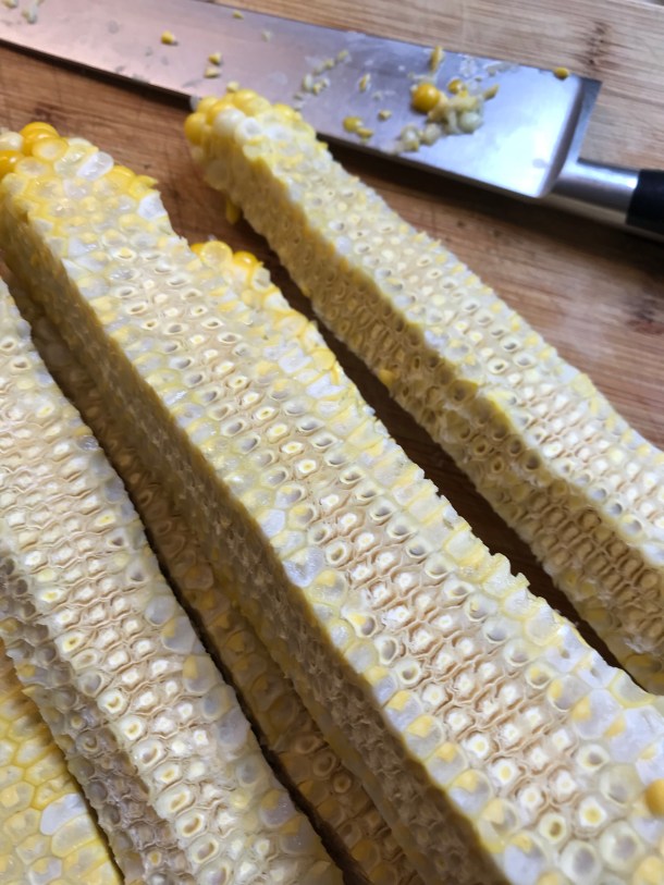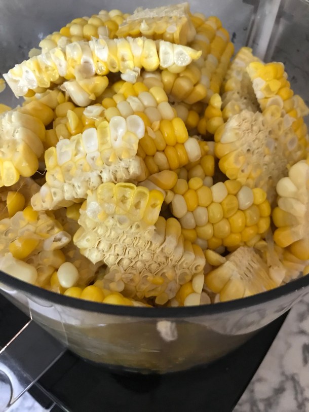 This recipe was inspired by a photo on Instagram. It’s a bed of puréed corn that is warmed and topped with colorful cherry tomatoes and seedless Concord grapes. The original picture idea had melon balls but I could not pass up these seedless Concord grapes! Serves 8