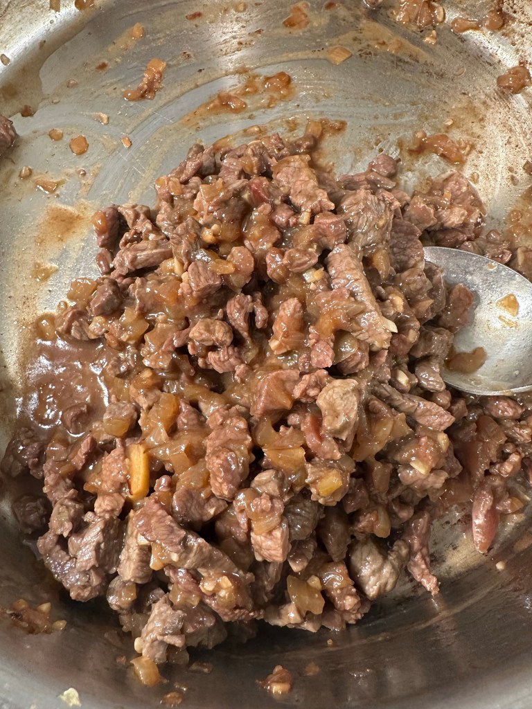 - Add beef and sauté or stir fry until browned. Add 4 tablespoons teriyaki marinade or sauce