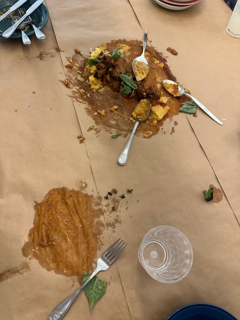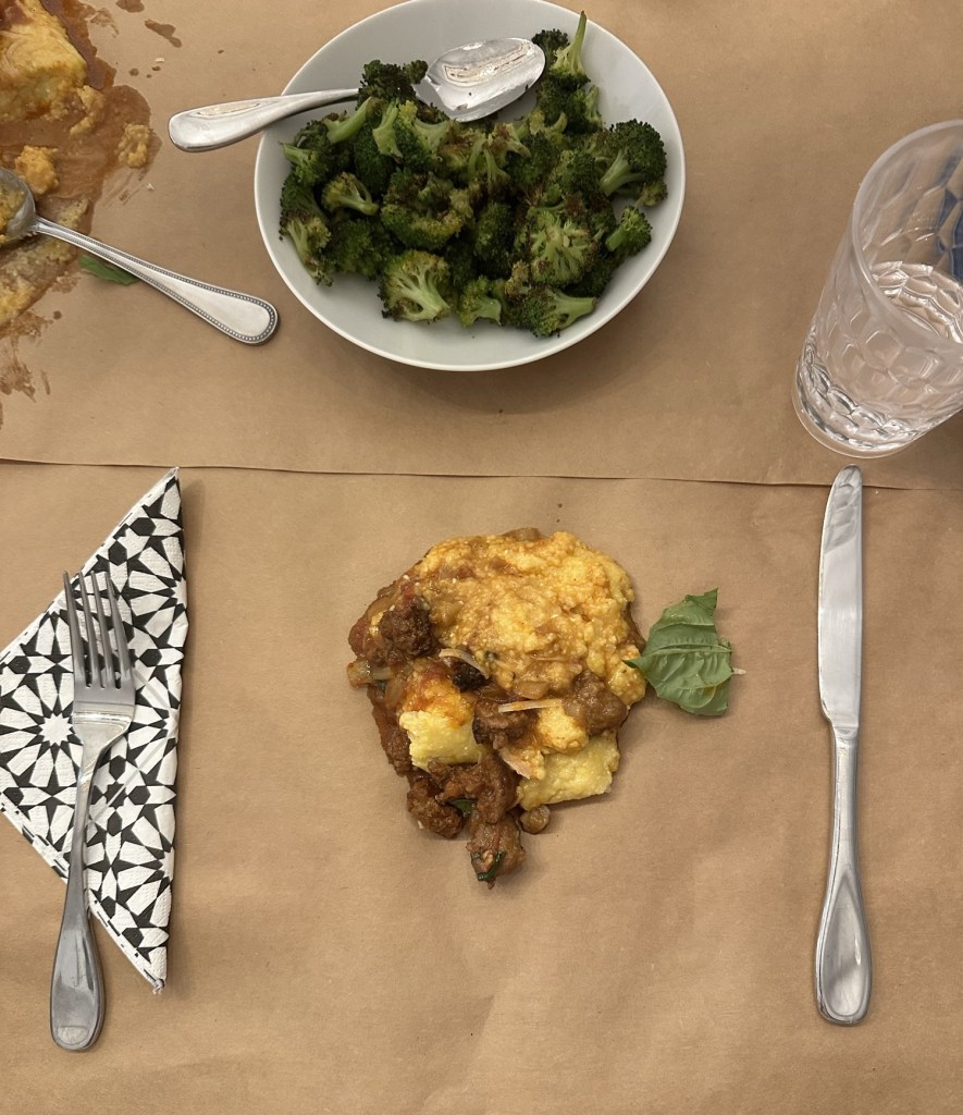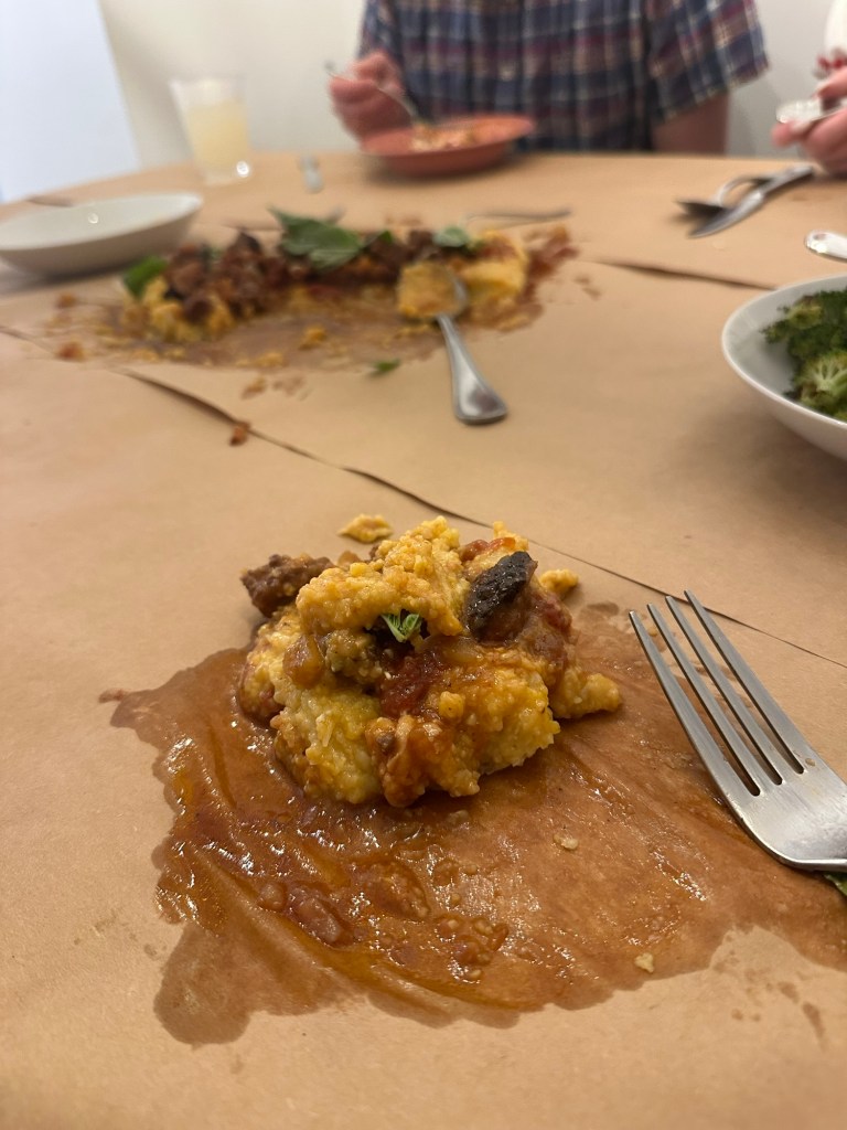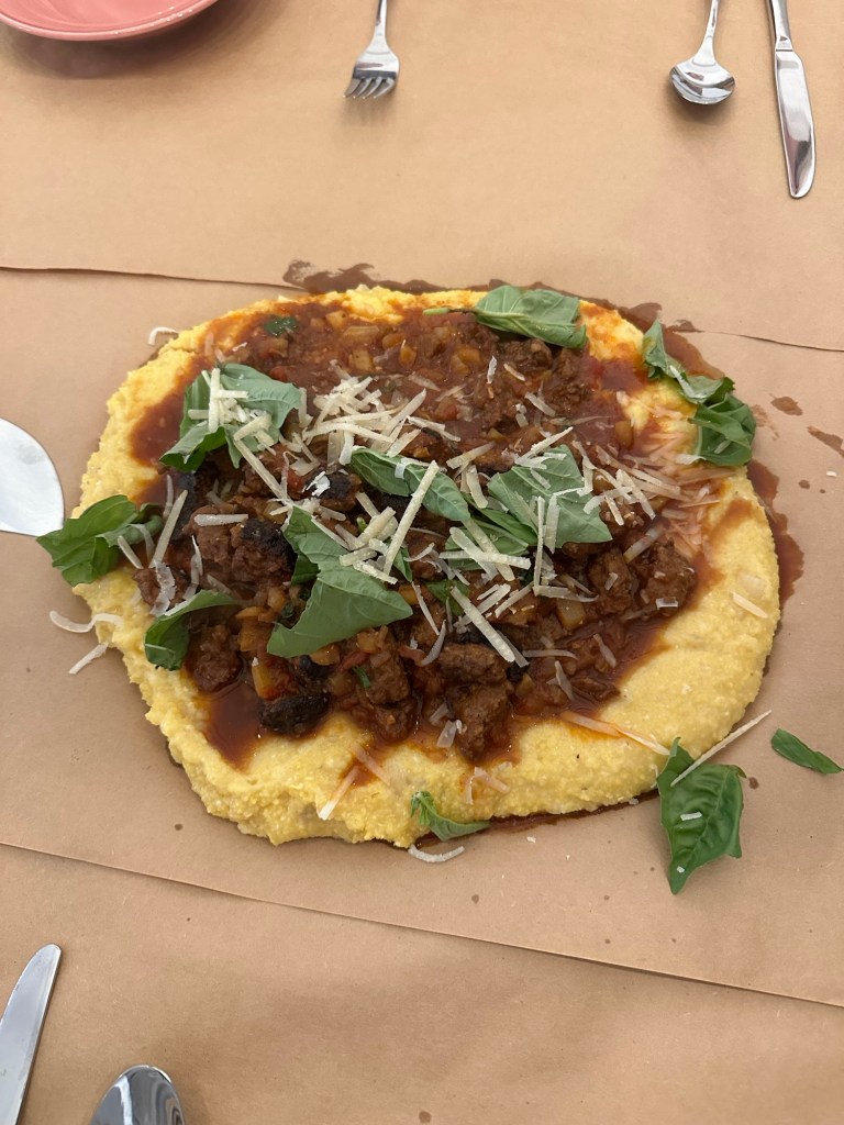 For the full effect, line your table with a plastic covering. Then top it with a heavy paper or a craft or butcher paper. Pour the polenta in the middle and using a large spoon give it a bowl like shape. Then fill the “polenta bowl” with the Italian sausage and tomato sauce. Add a final shredding of Parmesan, scatter fresh basil over it all and you’re ready to go. If you want more veggies, add a pile or bowl of roasted broccoli to the table.