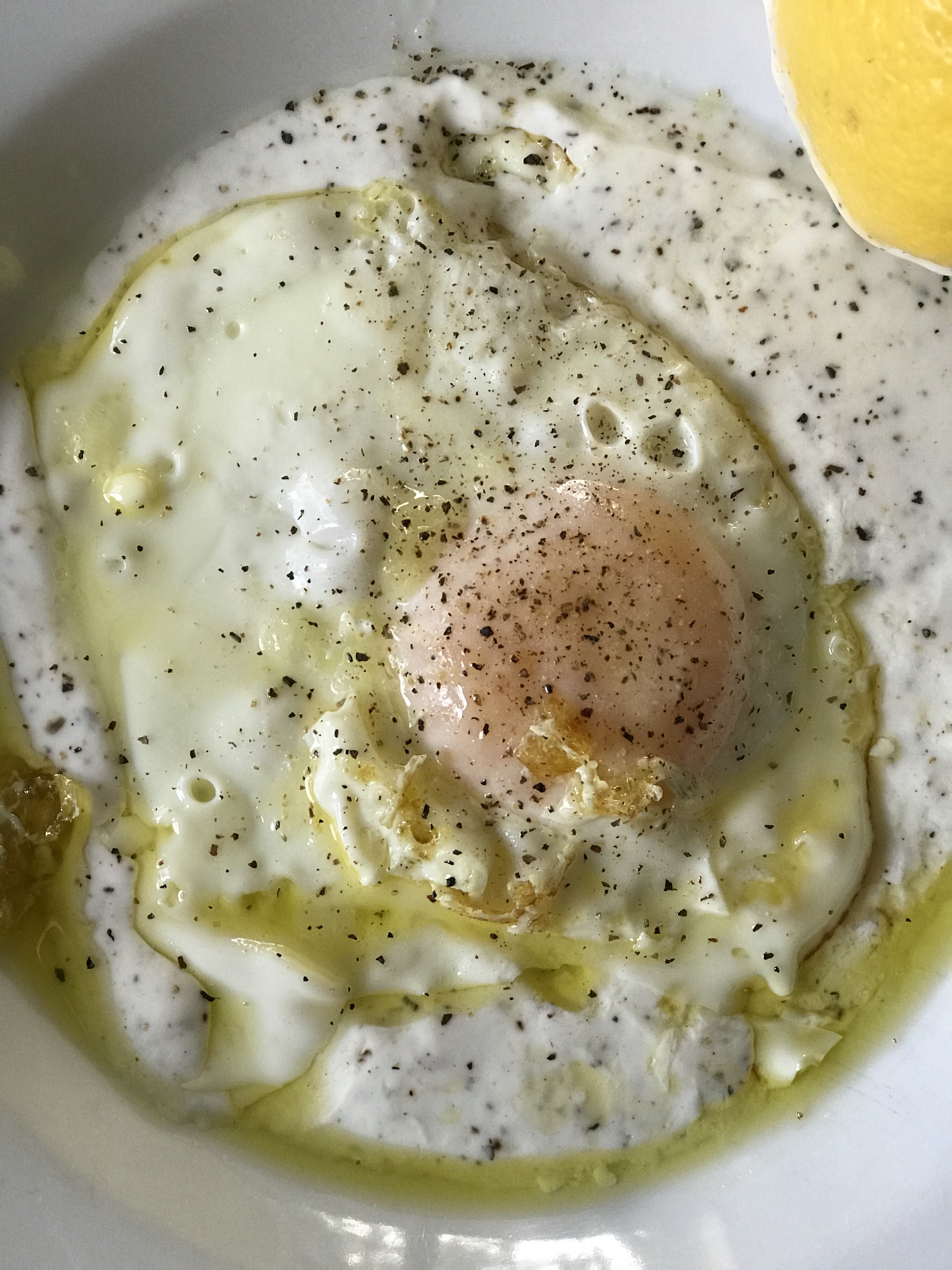 3. Let the eggs cook until the whites are cooked through but the yolks are still a bit wobbly, just a minute or two. Transfer the eggs to the prepared plate setting them on top of the yogurt, then pour the remaining olive oil from the pan over the top. Squeeze whatever juice remains in the lemon half and scatter the herbs over all.