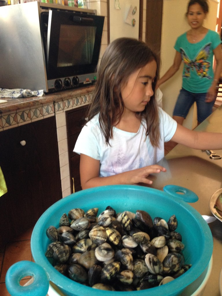 These clams are scrubbed and combined in a large pot with roughly chopped garlic and parsley and olive oil. Place over heat and cover till opened.