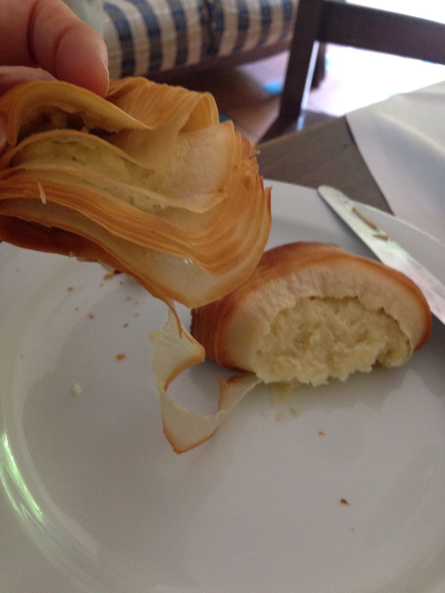 Sfogliatella is a ruffle of layers filled with ricotta that’s sometimes lemon flavored. Sfogliatella means small thin leaves/layers as the pastry resembles stacked leaves.