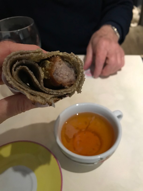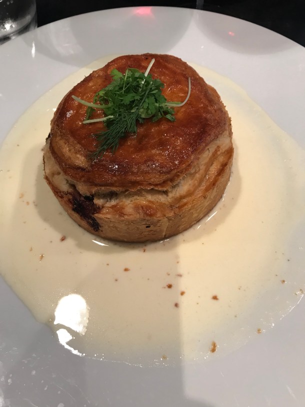 Dave’s was a phyllo triangle filled with beef tail and foie gras over salad