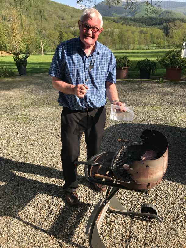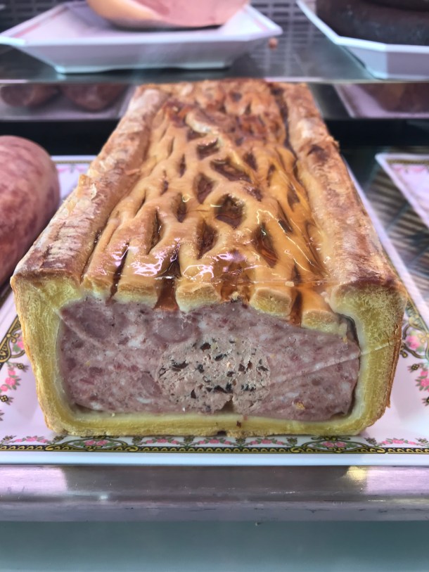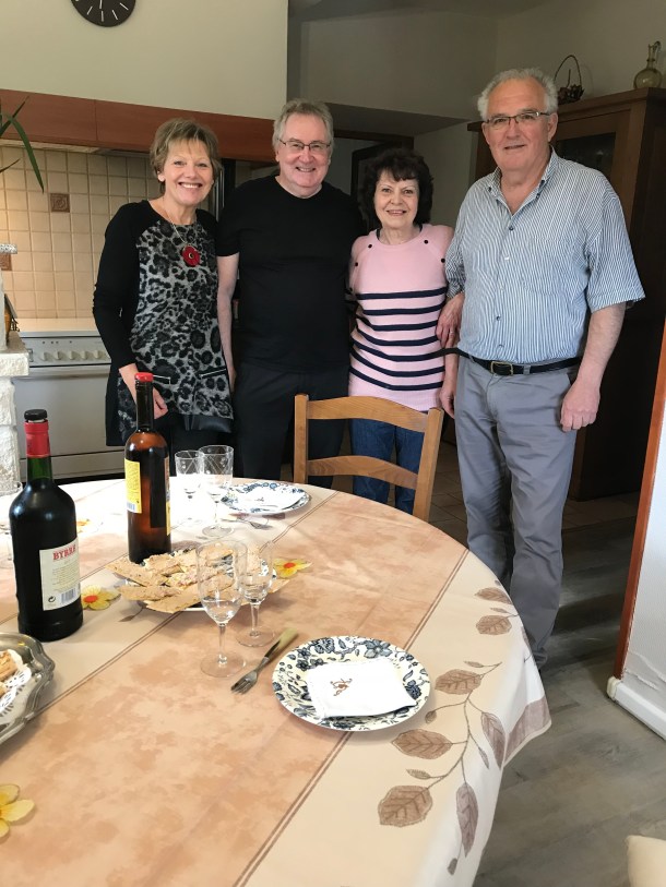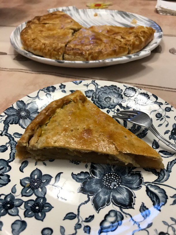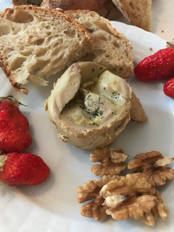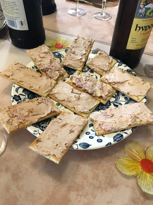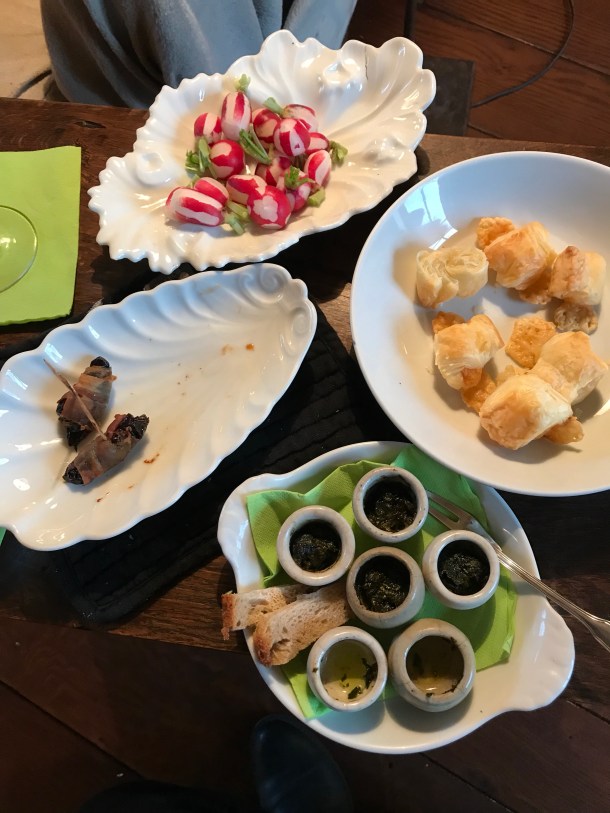 Our hosts invited us for an aperitif which turned out to be dinner. AperitifDinatoire!They are so kind and talented! We were treated to puff pastry filled with cheese, or olive or ham. Next they brought out tiny ramekins of escargot baked with a little garlic and parsley. Then we had prunes wrapped in prosciutto and baked. The last were pretty radishes peeled to a striped pattern!