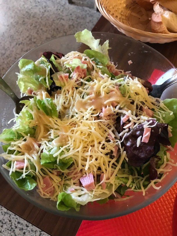 First was a tasty salad made of red and green Bibb lettuce, cubed ham, grated cheese and a dressing of olive oil, mustard, Aromé seasoning by Maggi. It has a lot of MSG in it!