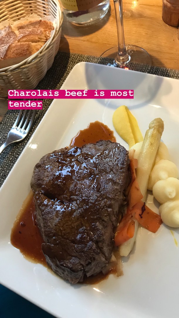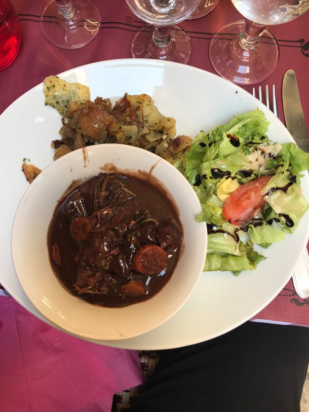 Beef Bourgogne is the classic dish of this region, so that’s what we ordered. It’s a type of beef stew that’s marinated in red wine overnight and is cooked for a long time. The cattle breed of Burgundy is used which is called Charolais.