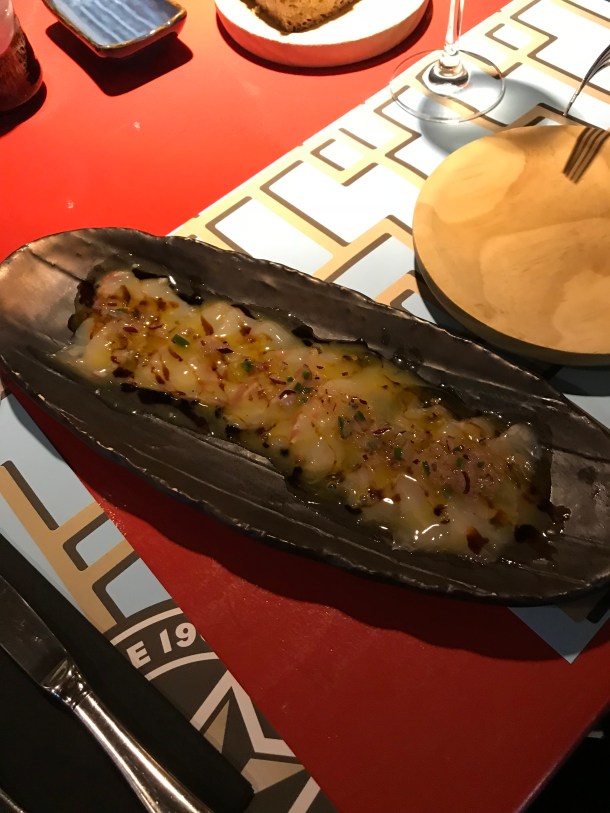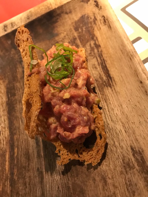 First on a platter we received a skewer of smoked fresh salmon and a cheese cracker