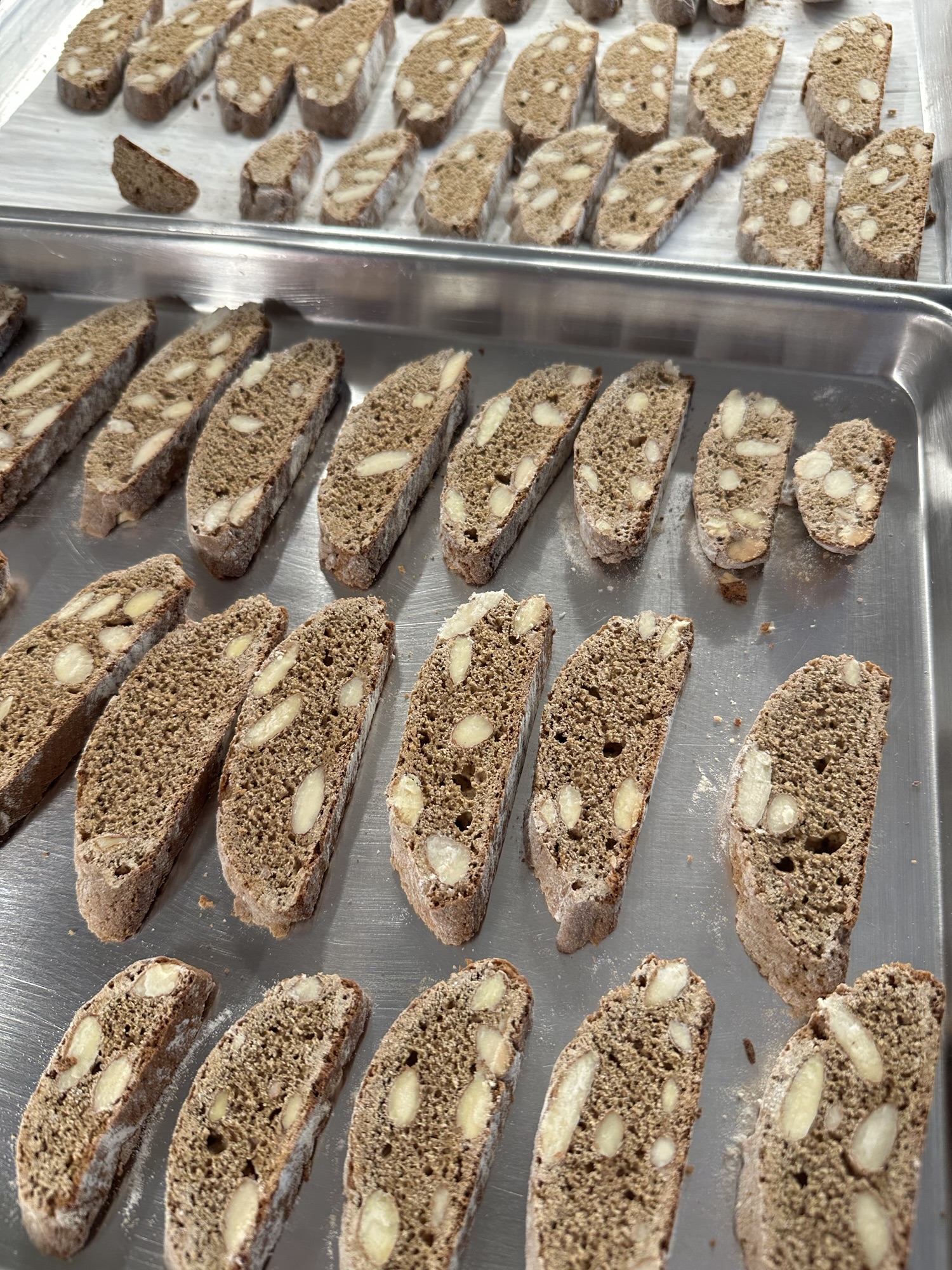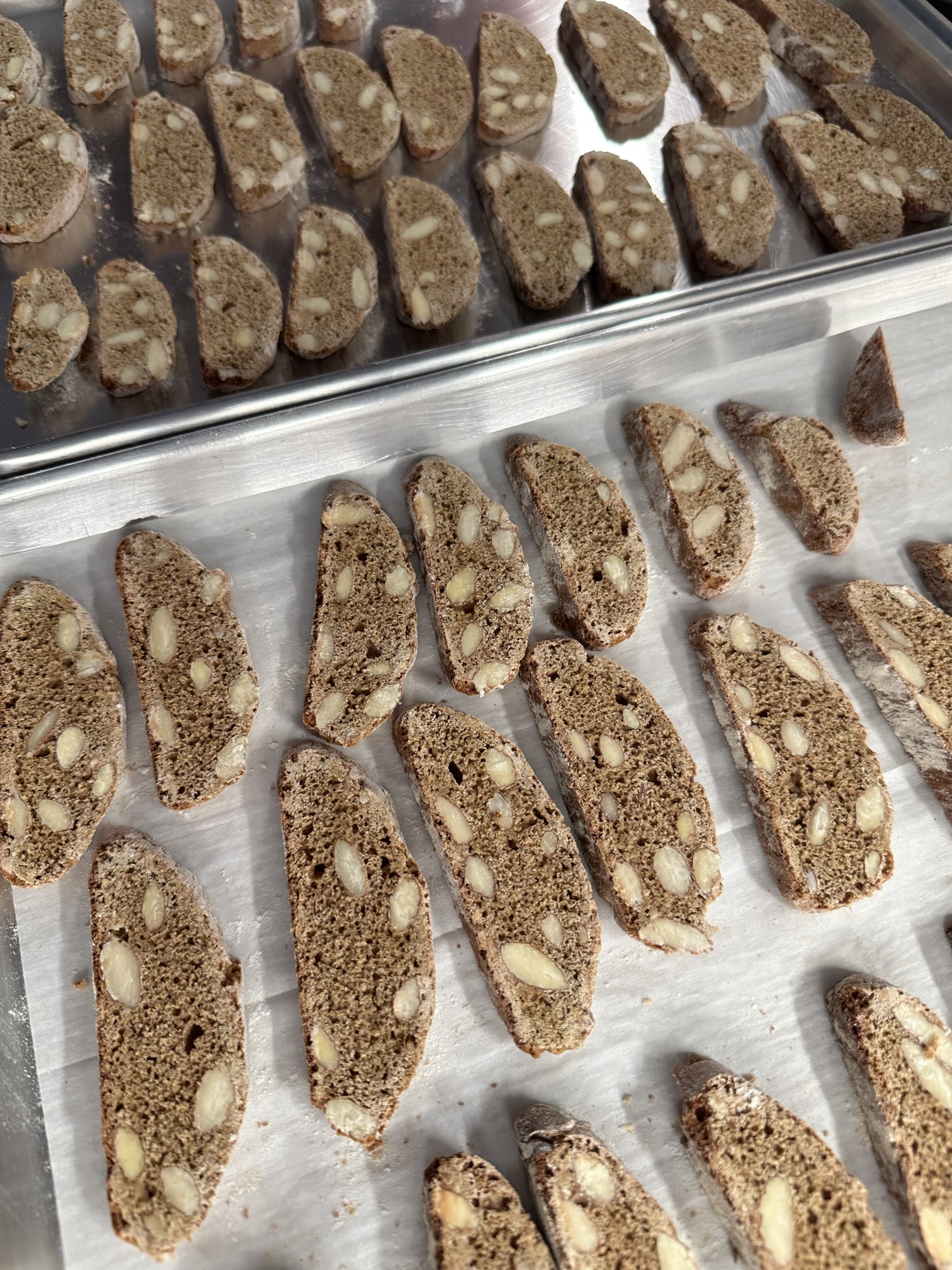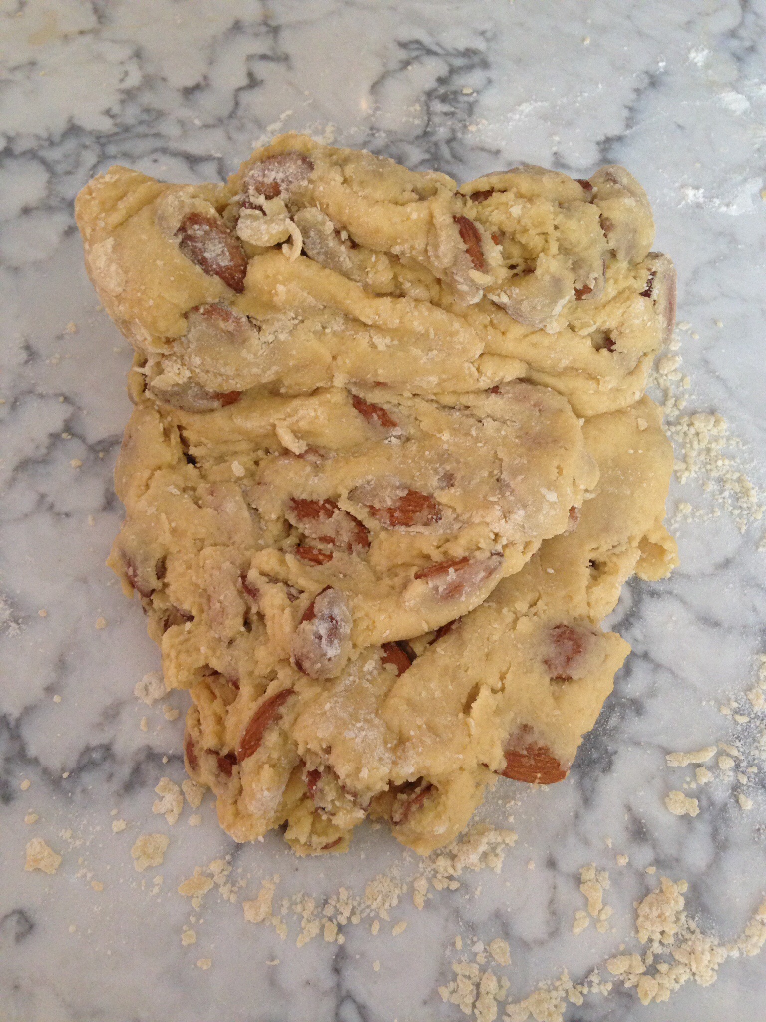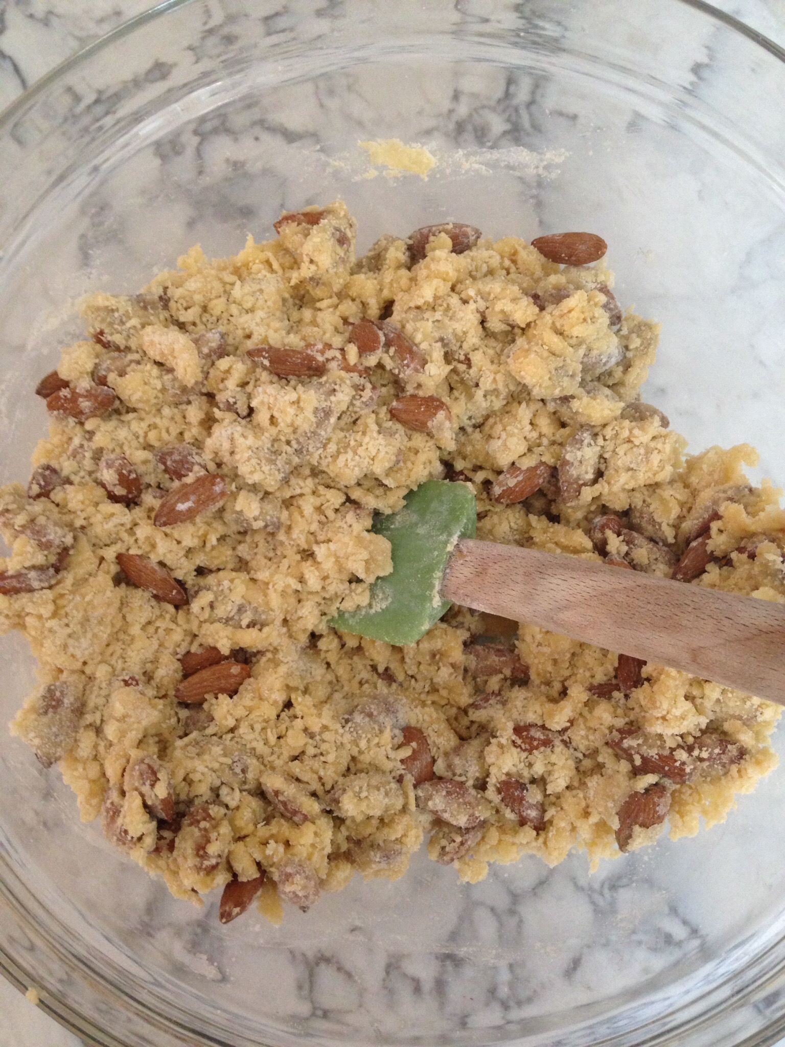 This makes a lot of cookie dough. You can freeze the extra dough or bake all the cookies and freeze the extras cookies. The color is a deep tan and the added flecks of finely chopped almonds adds texture and interest.