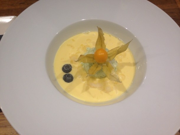 Cool dessert! Orange and orange blossom cream sauce with mint ice cream and gin slush over all. The orange like garnish was amazing. It is called a ground cherry or a husk tomato and is sweet and tart. (Physalis) Reminds me of the Chinese lantern ornamental plant in the Midwest.
