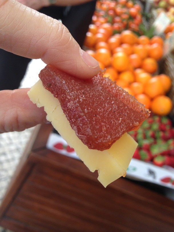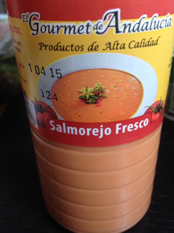 Salmorejo is a puréed cold soup made with fresh tomatoes, fresh bread, garlic, olive oil and salt. It can be purchased at the local fresh food markets or made at home. We also saw this served as a dipping sauce with bread in Lisbon.