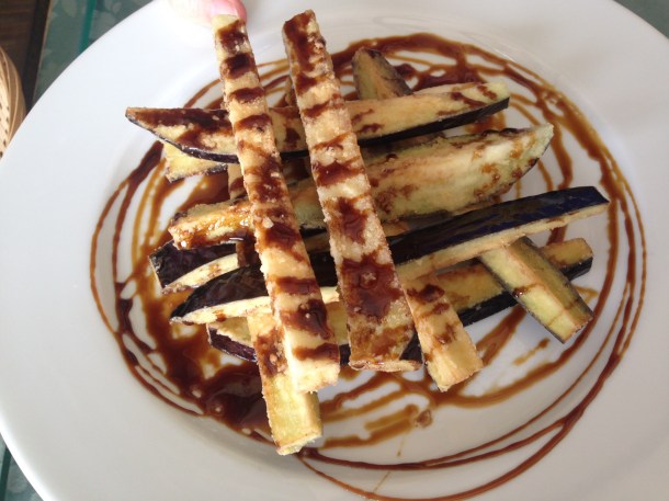 This is eggplant believe it or not! It’s cut into thick strips and quickly fried and then brushed with a dark honey and balsamic vinegar glaze.