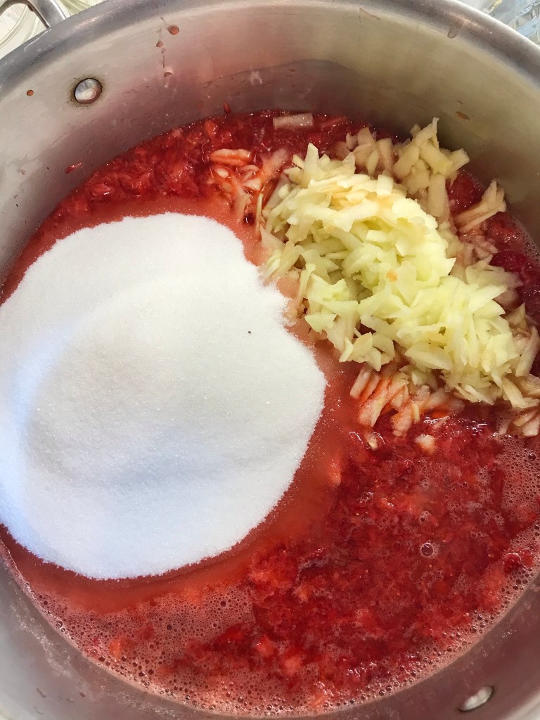 This recipe is from America’s Test Kitchen. No powdered pectin is added to thicken the jam. Since apples contain lots of natural pectin, grated Granny Smitb apple is the thickener.