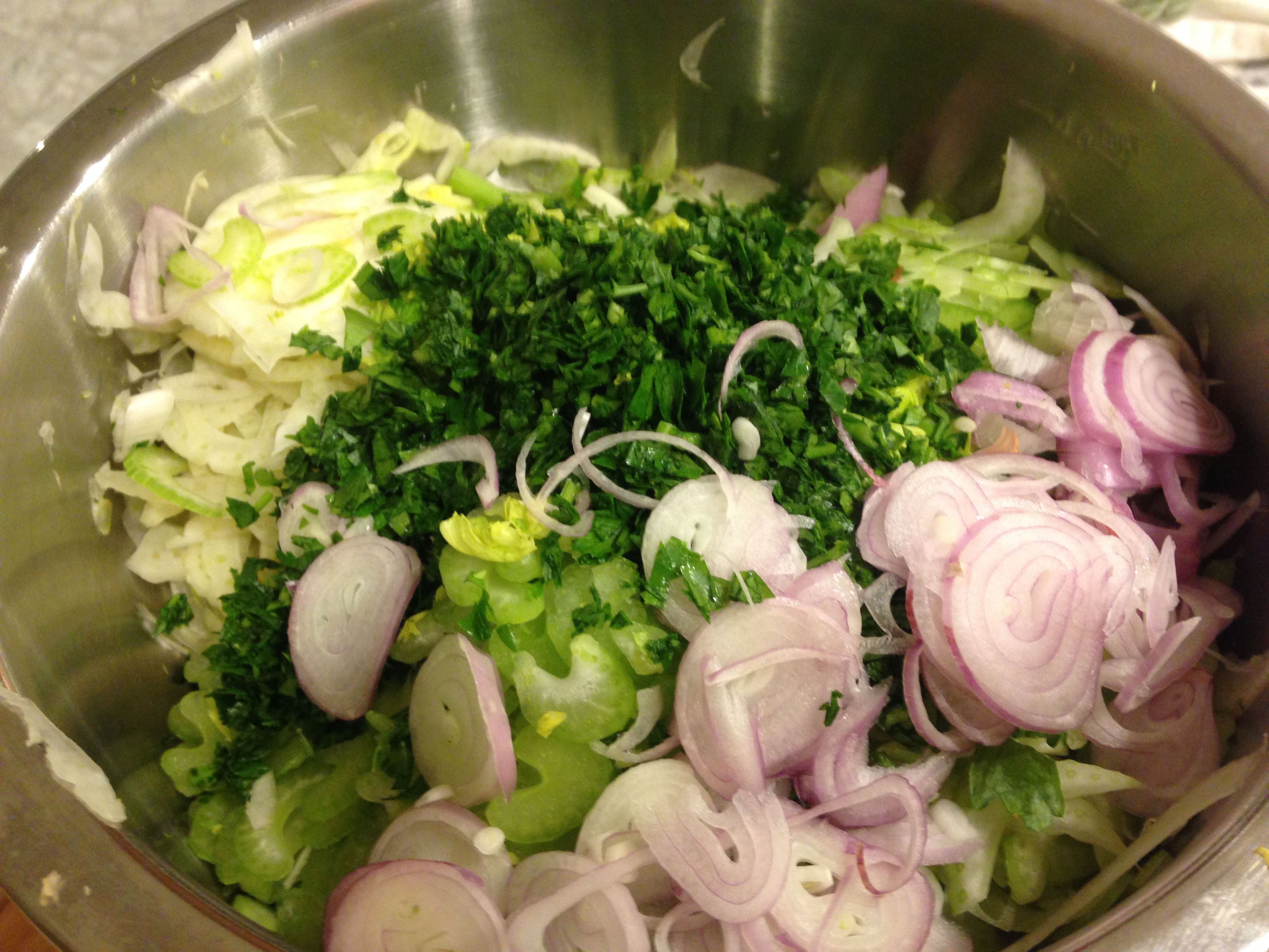 - Fill a large pot with water and add onion, celery sticks, 2 teaspoons salt, peppercorns and bay leaf. Bring to a boil.