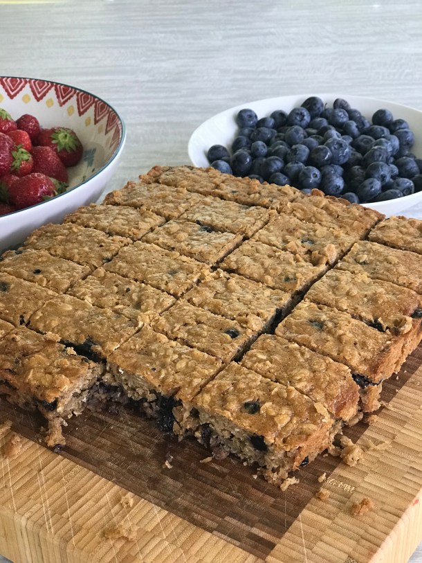 Wholefoodbellies.com shared this recipe and we love it! It’s quick to put together and does not require complicated baking skills. I changed it up a bit by adding blueberry preserves in between 2 layers of batter. Also I substituted cashew butter for the applesauce. It would also be tasty to add some shredded coconut to the mix!