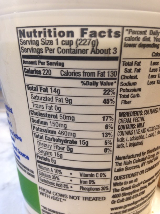 The nutrition label of the whole milk Greek yogurt. 14 grams of fat is about a tablespoon per cup