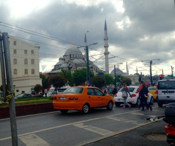 Families walking through traffic on busy Istanbul streets