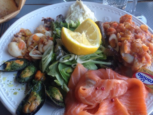Lunch in France is decadent! Here is the most tender smoked salmon, mussels with butter parsley sauce, tiny squid salad, brandada ( a cod mashed with potato and cream ), a diced raw tuna salad! Voila!