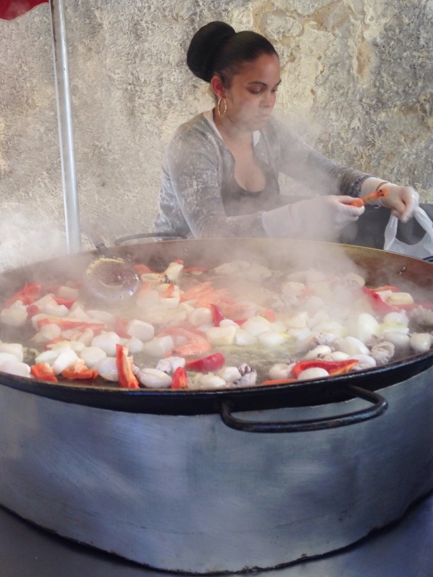 Andalusian style seafood paella. All these foods are cooked right on the spot!