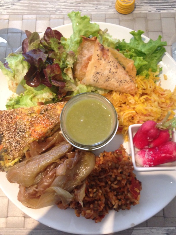 A vegetarian platter of braised endive, a vegetable tart, phyllo wrapped around apple and radish leaf soup!