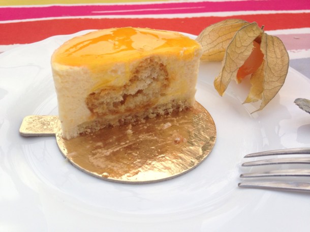 A beautiful  light mousse filled with cake and topped with an exotic fruit and it’s petals called a ground cherry or husk tomato.