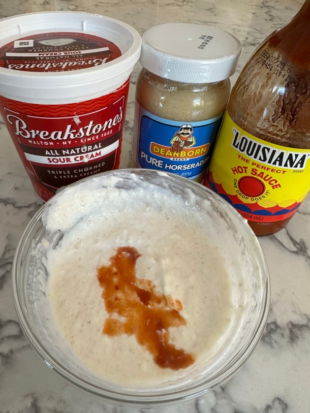 - In a small bowl combine sour cream, horseradish and hot sauce.