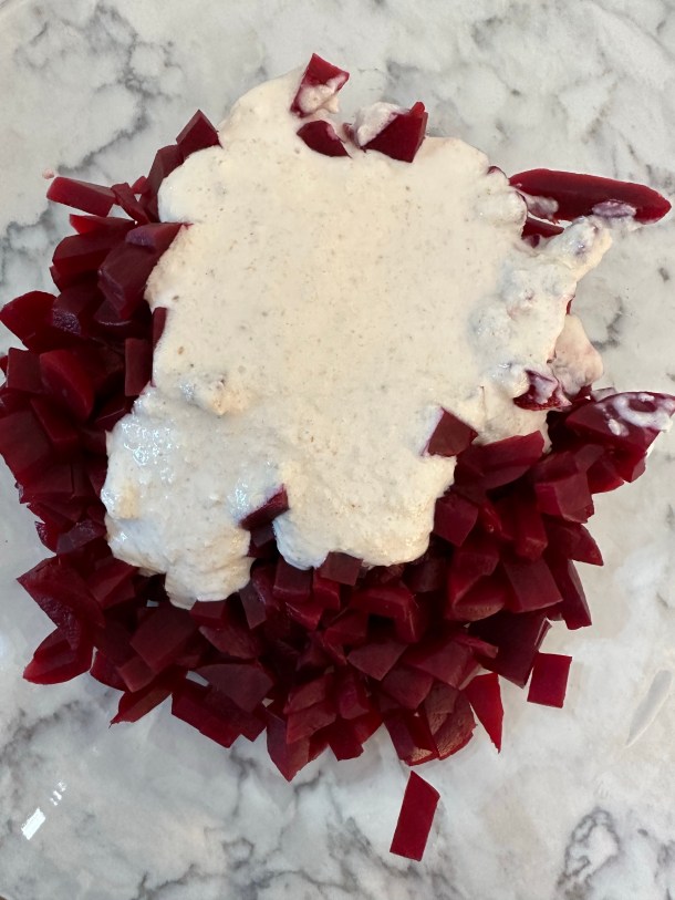 Horseradish Beet Salad adapted from my experiences working in the 1970s at Strongbow’s Turkey Inn, Valparaiso Indiana