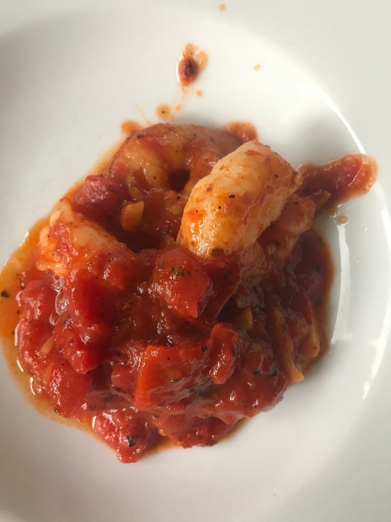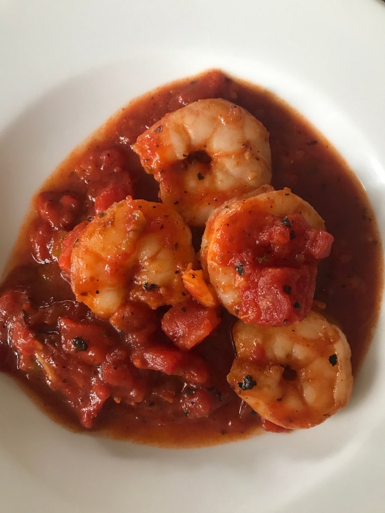 Arrabbiata is an Italian word meaning angry and refers to the spiciness of the chili peppers. This sauce is usually made of garlic, tomatoes, and dried red chili peppers cooked in olive oil. It’s served with pasta or in this case shrimp and crusty Italian bread. Dave and I are limiting our carbs, so we ate the shrimp and sauce with a green salad! Perfecto!
