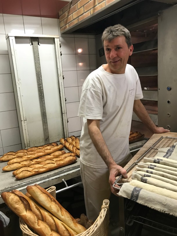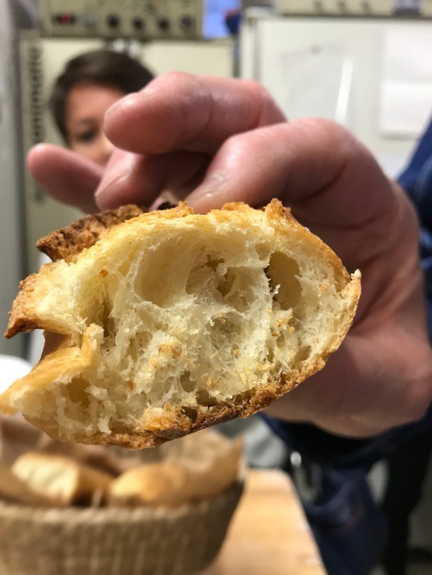 Here is a video of the dough made the morning before. It is full of bubbles and is being poured into a square machine that cuts the dough into baguette size portions:
