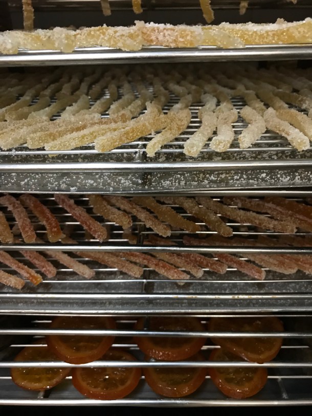 Candied fruit is drying on racks waiting to be used to decorate the pastries: