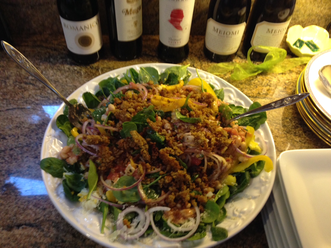 This spinach salad is reminiscent of the 1970s version which includes red onion, chopped egg, bacon pieces and a red wine vinaigrette. The Fusion 1 Café recipe goes beyond this, adding northern beans to the dressing. Bacon is substituted with a crumbly mix of toasted whole grain bread crumbs and parmesan cheese. I used a very hearty whole grain bread which is my favorite choice Kroger Private Selections Artisian Multi- Grain Boule.