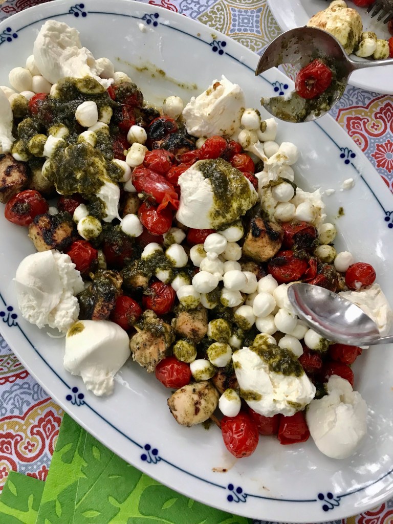 Make a marinade with pesto for the chicken. Skewer it with tomatoes. Grill. Serve on a platter with burrata, mini mozzarella balls and more pesto marinade. Tieghan serves it with grilled bread, but it’s also yummy on pasta!