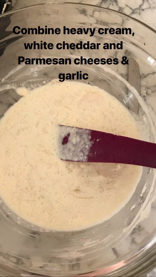 - In a large bowl combine cream, cheeses, garlic, salt and pepper
