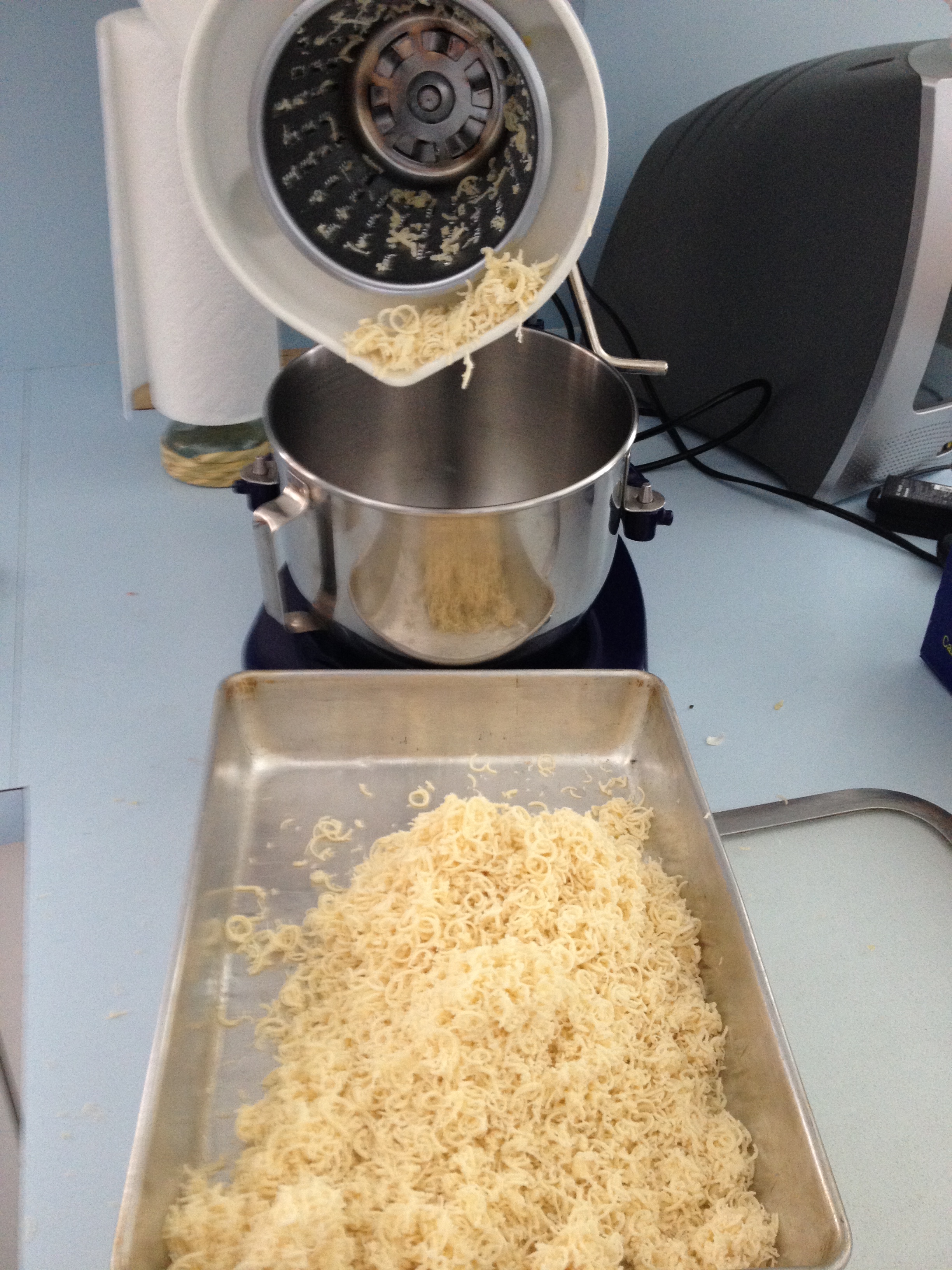 10. Using the grating attachment of a Kitchen Aid Mixer or the large holes of a box grater, grate 1 piece of dough into a 9 x 13 inch baking pan. Lightly pat the dough evenly and gently, but don’t press down too firmly. A simple aluminum pan is my favorite