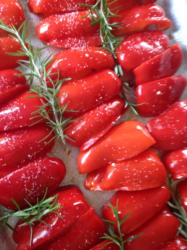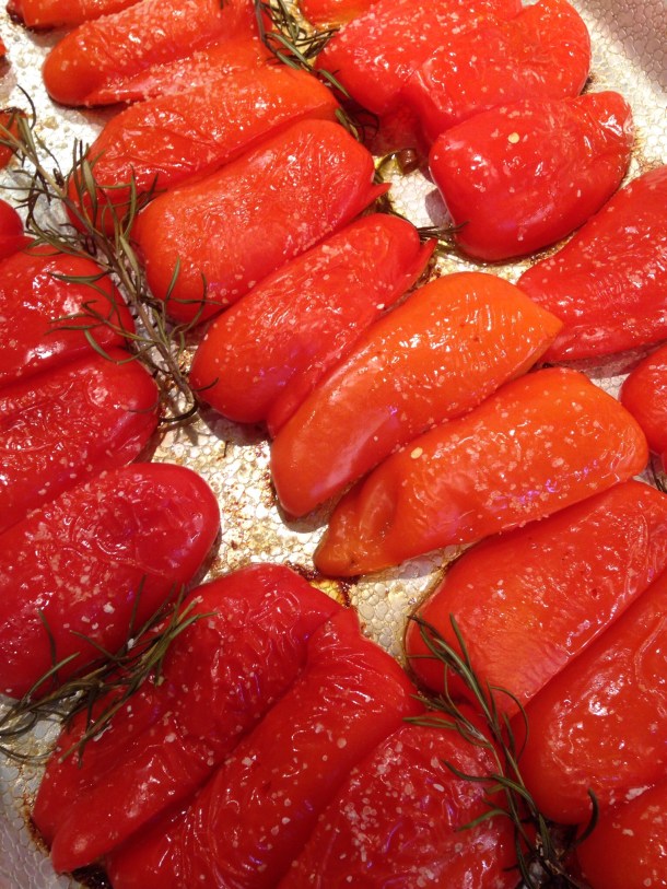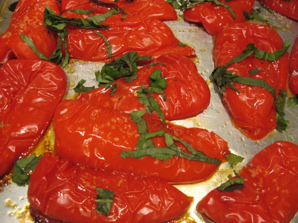 - If you haven’t added the Rosemary, you can add several basil leaves, cut julienne style and toss over the peppers in the baking pan. Let sit 5 minutes.