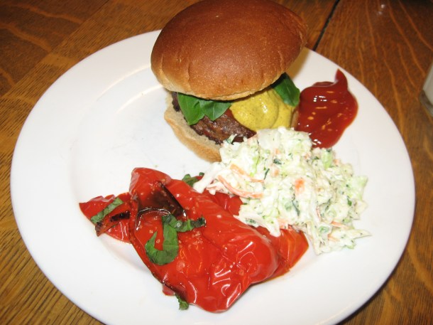 Roasted Peppers served here with Spicy Cilantro Cole Slaw and Grilled Hamburgers.