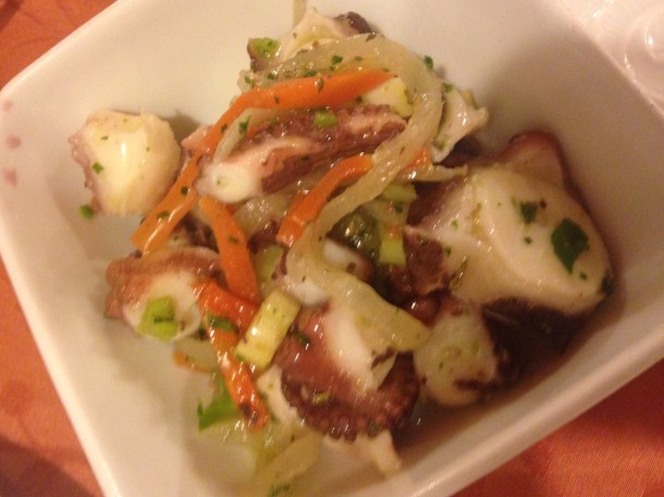 Marinated Octopus, carrot,and fennel over arugula served on a no