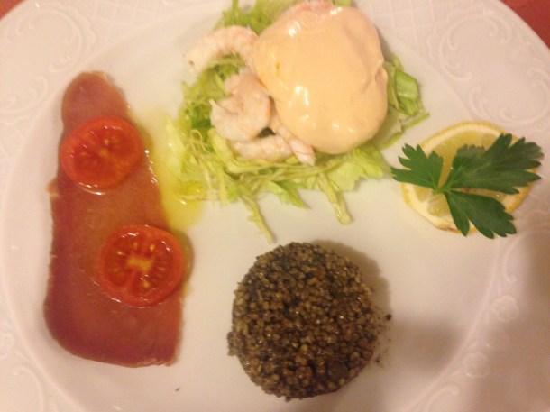 Smoked tuna and tomatoes, octopus salad, bruschetta with onion, chicken cutlets, an antipasti