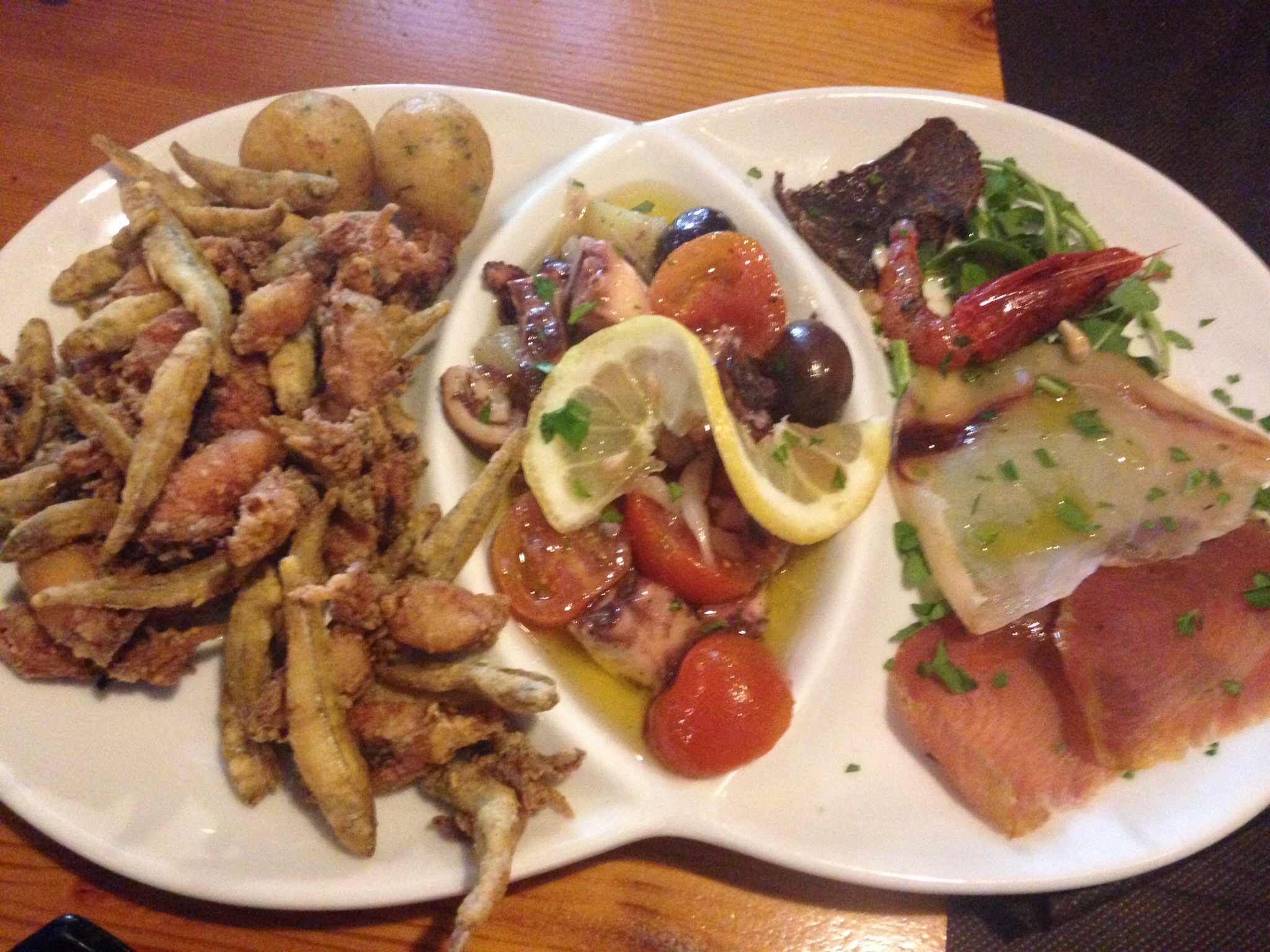 Fried tiny fish, calamari and shrimp, octopus salad, and 3 dried fish slices with olive oil and balsamic.
