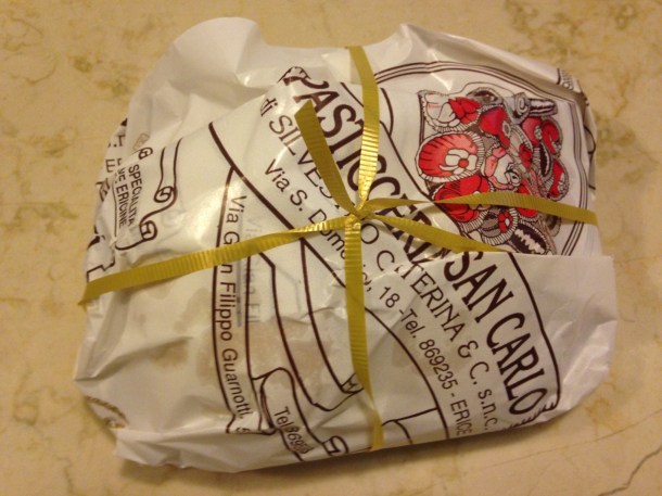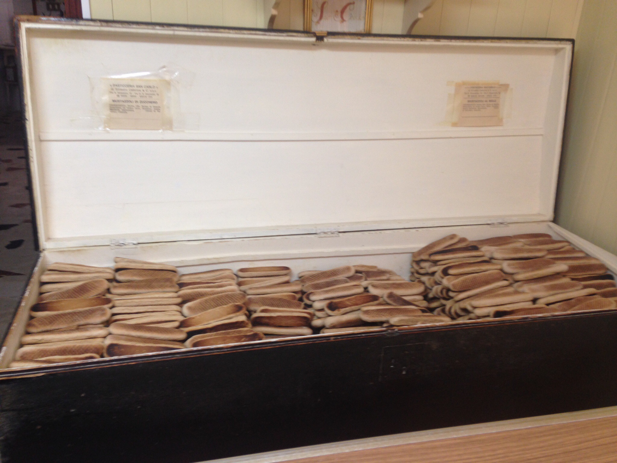 Pasticceria San Carlo was a favorite in Erice. Here is a coffin full of plain biscotti drying. These are 6 inches long!